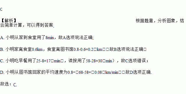C. 小明吃早餐用了30min,读报用了17min D. 小明从图书馆回家的平均速度为0.08km/min