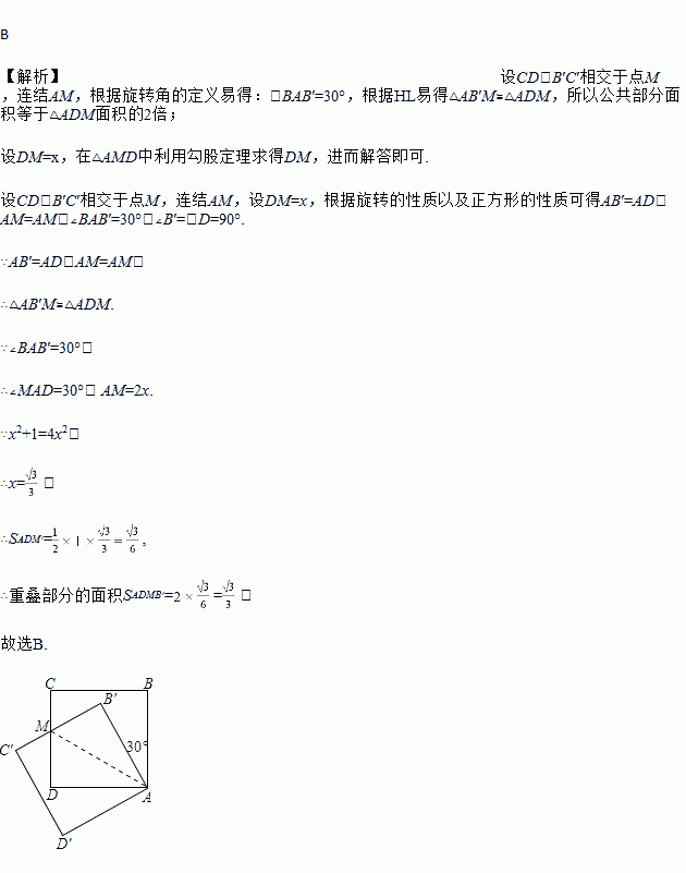 如图,把边长为1的正方形ABCD绕顶点A逆时针旋转30°到正方形AB′C′D′,则它们的公共部分的面积等于( )