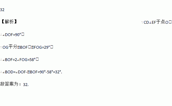 如图,直线AB、CD、EF相交于点0,CD⊥EF,OG平分∠BOF.若∠FOG=29°,则∠BOD的大小为_____度.