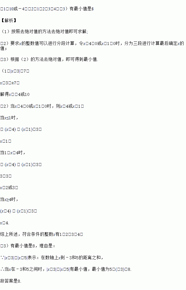 (2)找出所有符合条件的整数x,使得|x﹣4|+|x﹣1|=3成立.