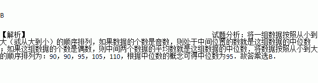 一次数学测验中,某小组五位同学的成绩分别是:110,105,90,95,90,则这五个数据的中位数是( )