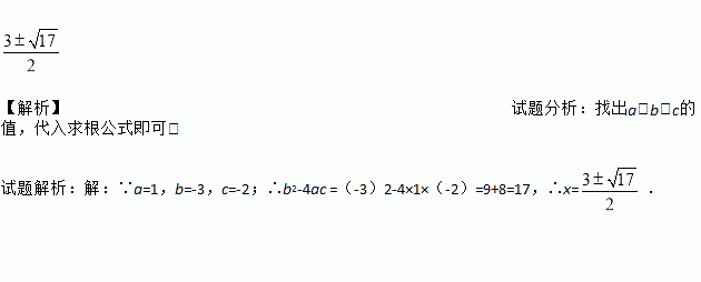 【解析】试题分析:找出a、b、c的值,代入求根公式即可. 试题解析:【解析】 ∵a=1,b=-3,c=-2;∴b2-4ac =(-3)2-4×1×(-2)=9+8=17,∴x=.