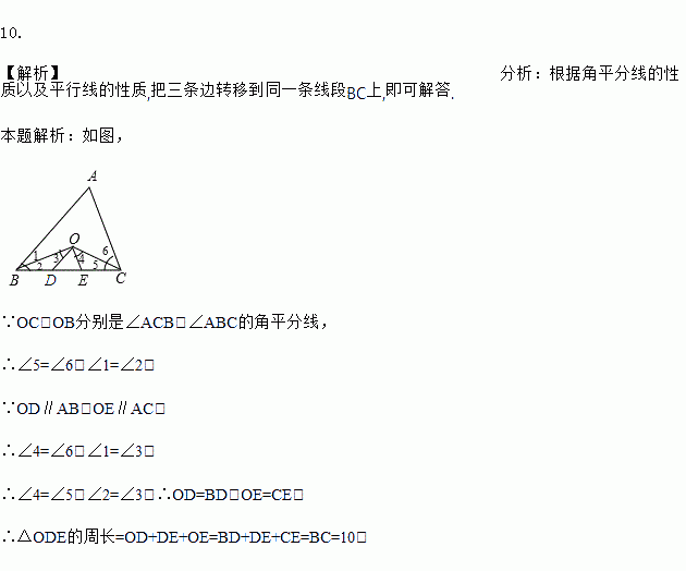 已知,如图,O是△ABC的∠ABC.∠ACB的角平分线的交点,OD∥AB交BC于D,OE∥AC交BC于E,若BC = 10,求△ODE的周长
