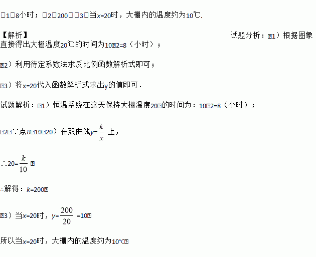 (1)8小时;(2)200;(3)当x=20时,大棚内的温度约为10℃. 【解析】试题分析:(1)根据图象直接得出大棚温度20℃的时间为10﹣2=8(小时); (2)利用待定系数法求反比例函数解析式即可; (3)将x=20代入函数解析式求出y的值即可. 试题解析:(1)恒温系统在这天保持大棚温度20℃的时间为:10﹣2=8(小时); (2)∵点B(10,20)在双曲线...