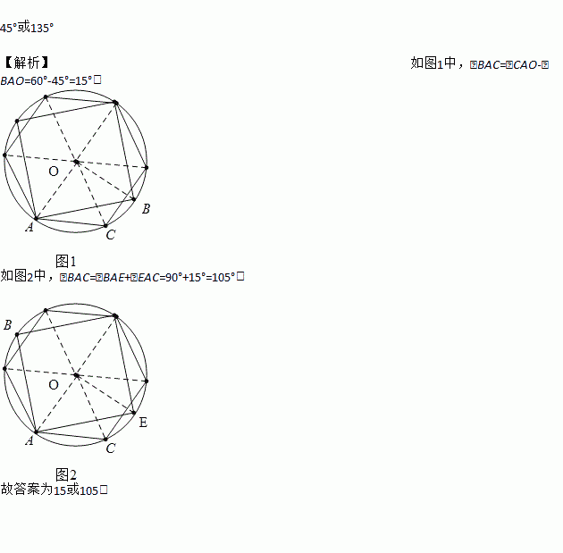 45°或135° 【解析】如图1中,∠BAC=∠CAO-∠BAO=60°-45°=15°, 如图2中,∠BAC=∠BAE+∠EAC=90°+15°=105°, 故答案为15或105.
