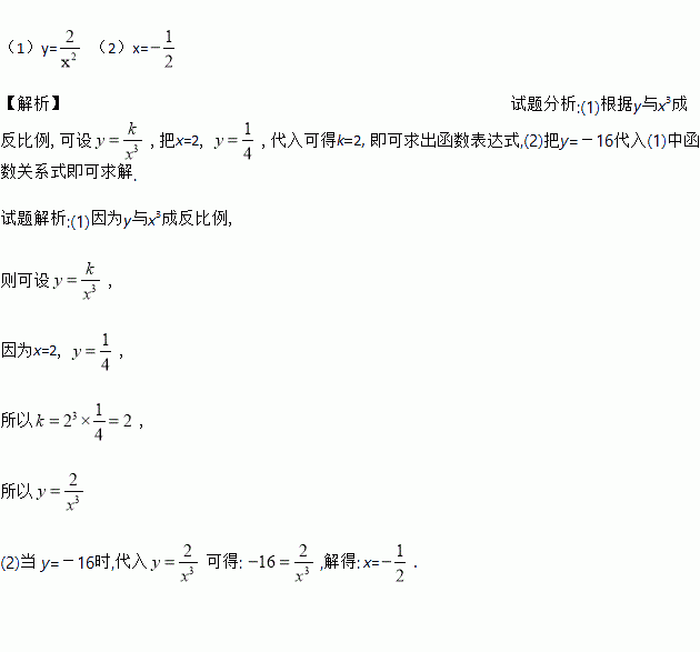 (1)y= (2)x= 【解析】试题分析:(1)根据y与x3成反比例,可设,把x=2, ,代入可得k=2, 即可求出函数表达式,(2)把y=-16代入(1)中函数关系式即可求解. 试题解析:(1)因为y与x3成反比例, 则可设, 因为x=2, , 所以, 所以 (2)当 y=-16时,代入可得: ,解得: x=.如图,点A在双曲线