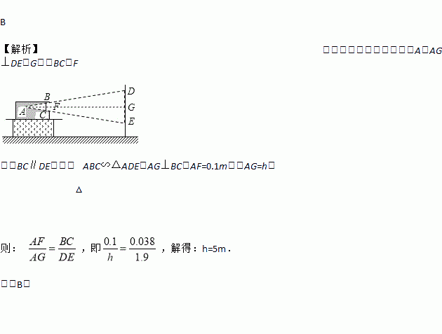 B 【解析】试题解析:如图所示,过A作AG⊥DE于G,交BC与F 因为BC∥DE,所以△ABC∽△ADE,AG⊥BC,AF=0.1m,设AG=h, 则: ,即,解得:h=5m. 故选B.