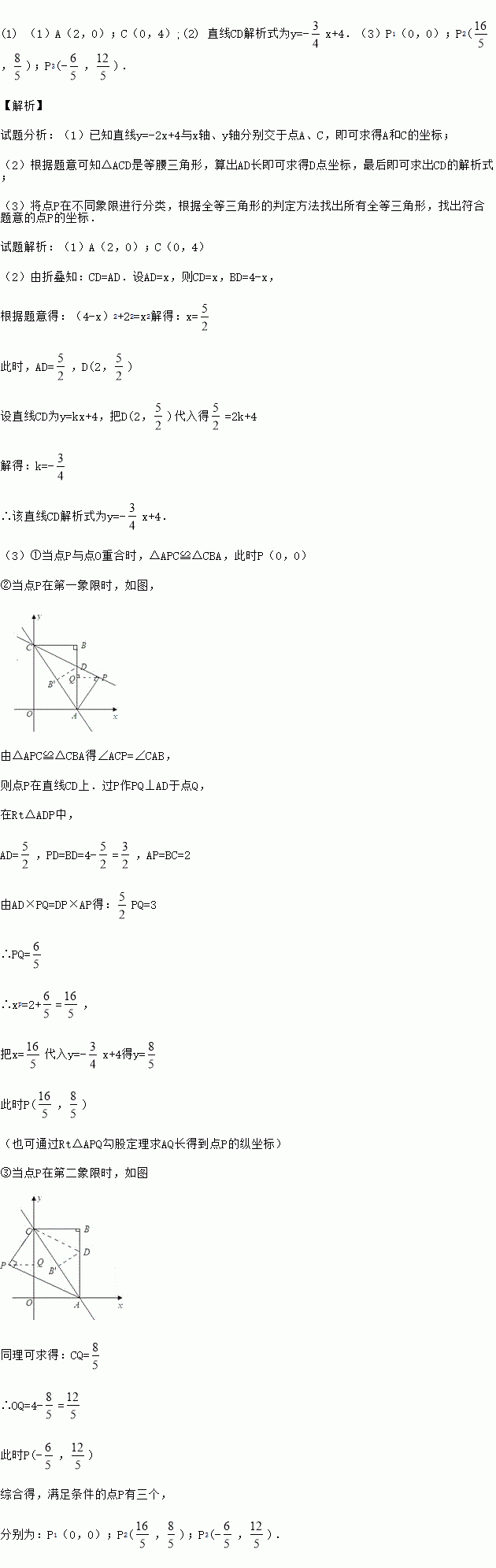 (1) (1)A(2,0);C(0,4);(2) 直线CD解析式为y=-x+4.(3)P1(0,0);P2(,);P3(-,). 【解析】 试题分析:(1)已知直线y=-2x+4与x轴、y轴分别交于点A、C,即可求得A和C的坐标; (2)根据题意可知△ACD是等腰三角形,算出AD长即可求得D点坐标,最后即可求出CD的解析式; (3)将点P在不同象限进行分类,根据全等三角形的...