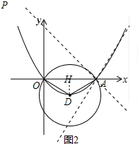 (3)当a=$\frac{\sqrt{3}}{3}$时,如图2,设点B是⊙D上的一个动点(异于O、A两点),函数y=kx-2k(k≠0)的图象与抛物线交于另一点P(异于O、A两点),请问:是否存在点P使得∠OAP=$\frac{1}{2}$∠OBA?若存在,求出点P的坐标;若不存在,请说明理由.