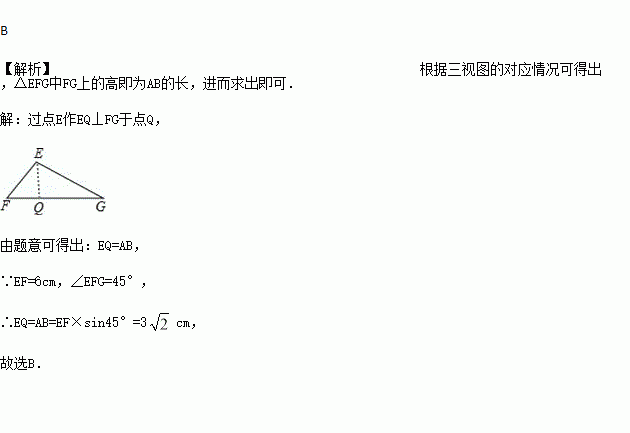 .三棱柱的三视图如图所示,△EFG中,EF=6cm,∠EFG=45°,则AB的长为( )