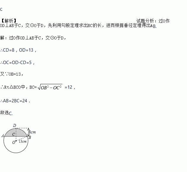 C 【解析】试题分析:过O作OD⊥AB于C,交⊙O于D,先利用勾股定理求出BC的长,进而根据垂径定理得出AB. 【解析】 过O作OD⊥AB于C,交⊙O于D, ∴CD=8,OD=13, ∴OC=OD-CD=5, 又∵OB=13, ∴Rt△BCO中,BC==12, ∴AB=2BC=24. 故选C.
