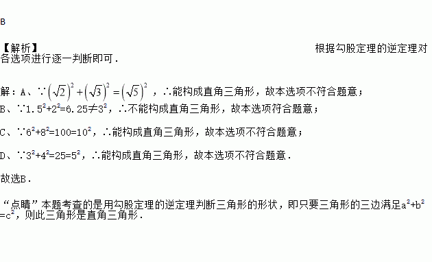 B 【解析】根据勾股定理的逆定理对各选项进行逐一判断即可. 【解析】 A、∵,∴能构成直角三角形,故本选项不符合题意; B、∵1.52+22=6.25≠32,∴不能构成直角三角形,故本选项符合题意; C、∵62+82=100=102,∴能构成直角三角形,故本选项不符合题意; D、∵32+42=25=52,∴能构成直角三角形,故本选项不符合题意. 故选B. “点睛”本题考...