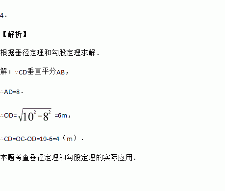 某蔬菜基地的圆弧形蔬菜大棚的剖面如图所示,已知AB=16m,半径OA=10m,则中间柱CD的高度为 m.