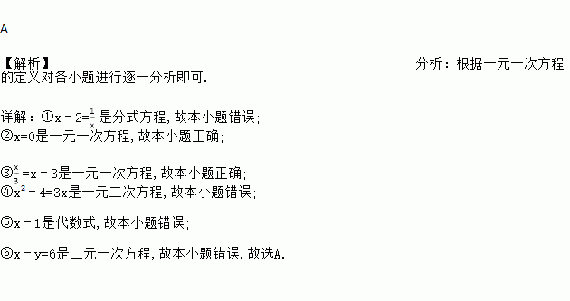 已知下列方程:①x﹣2=;②x=0;③=x﹣3;④x2﹣4=3x;⑤x﹣1;⑥x﹣y=6,其中一元一次方程有( )