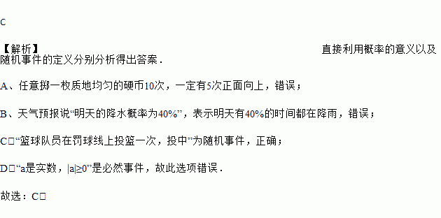 C. “篮球队员在罚球线上投篮一次,投中”为随机事件