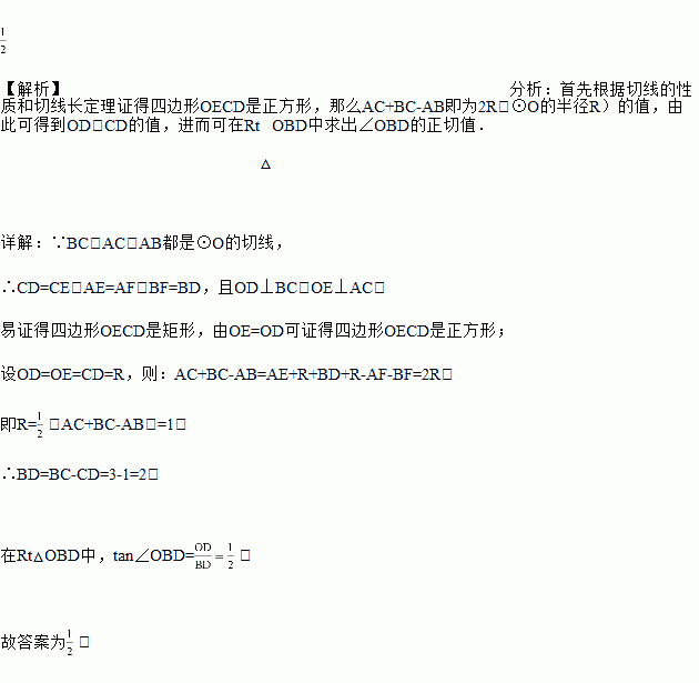 如图,在△ABC中,已知∠C=90°,BC=3,AC=4,⊙O是内切圆,E,F,D分别为切点,则tan∠OBD的值为___________.