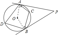 分析:连接OA、OB,根据切线的性质得出∠OAP的度数,∠OBP的度数;再根据四边形的内角和是360°,求出∠AOB的度数,有圆周角定理或圆内接四边形的性质,求出∠ACB的度数即可.