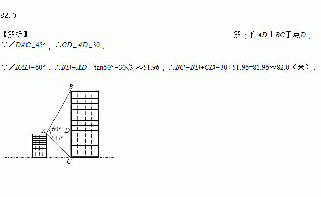 如图所示,小明在家里楼顶上的点A处,测量建在与小明家楼房同一水平线上相邻的电梯楼的高,在点A处看电梯楼顶部点B处的仰角为60°,在点A处看这栋电梯楼底部点C处的俯角为45°,两栋楼之间的距离为30m,则电梯楼的高BC为_____米(精确到0.1).(参考数据: