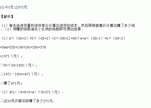 (1)问该服装店售完这30件衣服后,赚了多少钱?