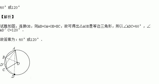 如图,A、B、C是⊙O上的三点,且四边形OABC是菱形.若点D是圆上异于A、B、C的另一点,则∠ADC的度数是___________________.