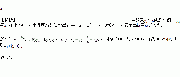 已知y=y1+y2,其中y1与x成反比例,且比例系数为k1(k1≠0),y2与x 成正比例,且比例系数为k2(k2≠0),当x=-1时,y=0,则k1与k2的关系是( )