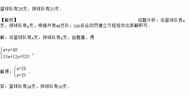 有48支队520名运动员参加篮球、排球比赛,其中每支篮球队10人,每支排球队12人,每名运动员只能参加一项比赛.问:篮球、排球队各有多少支?