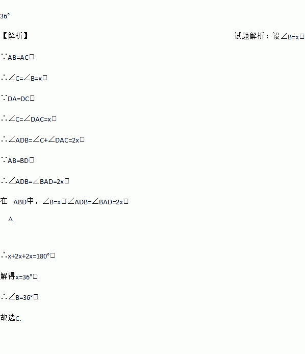 如图,在△ABC中,AB=AC=BD,DA=DC,则∠B的度数是______.