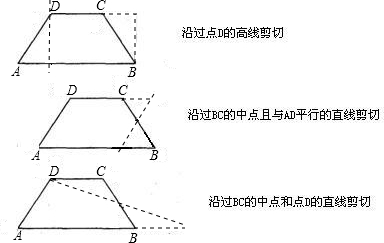 如图所示为三张等腰梯形形状的纸片,请在每张纸片上分别只剪一刀,然后拼成符合要求的图形.要求:①在等腰梯形上画出剪切的痕迹(虚线),并在图上作出必要的标注或在图形的下方给出文字说明;②在原图上画出所要拼成的图形.