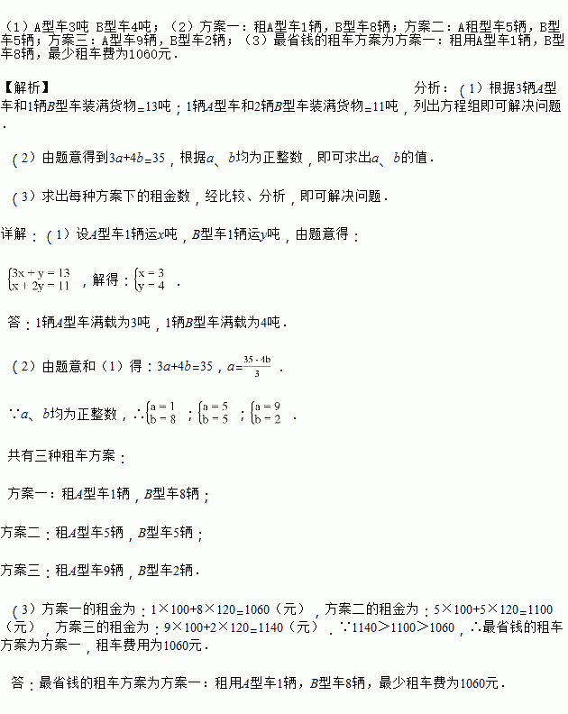 已知:用3辆A型车和1辆B型车装满货物一次可运货13吨;用1辆A型车和2辆B型车装满货物一次可运货11吨.某物流公司现有35吨货物,计划同时租用A型车辆,B型车![]()