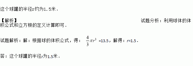 某居民生活小区需要建一个大型的球形储水罐,需储水13.5立方米,那么这个球罐的半径r为多少米(球的体积V=