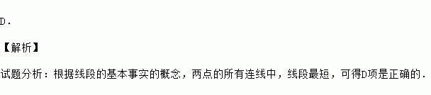 D. 【解析】 试题分析:根据线段的基本事实的概念,两点的所有连线中,线段最短,可得D项是正确的.