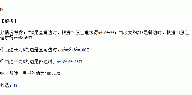直角三角形的三边长分别是6,8,x,则x2的值是( )