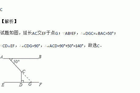 如图,AB∥EF,CD⊥EF,∠BAC=50°,则∠ACD=( )