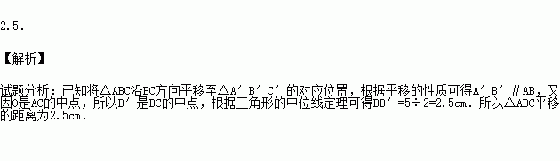 如图,△ABC中,BC=5cm,将△ABC沿BC方向平移至△A’B’C’的位置时,A’B’恰好经过AC的中点O,则△ABC平移的距离为 cm.