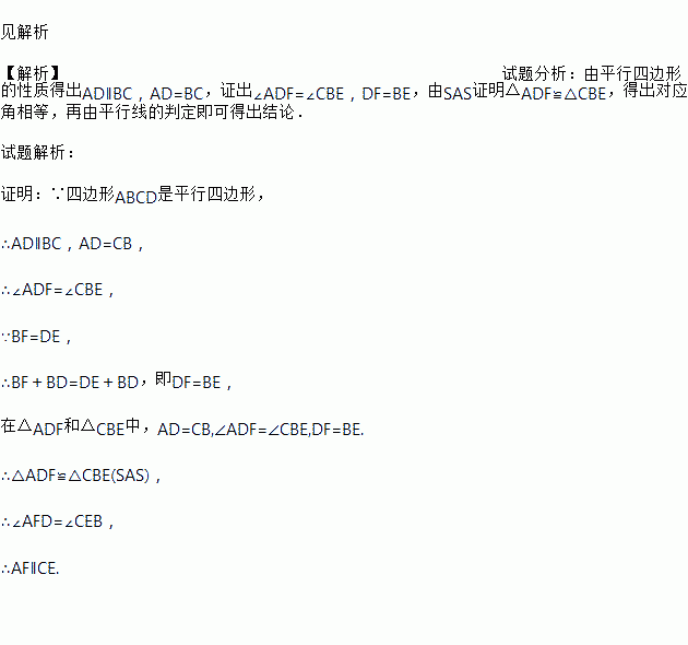 如图,在?ABCD中,连结BD,在BD的延长线上取一点E,在DB的延长线上取一点F,使BF=DE,连结AF,CE.