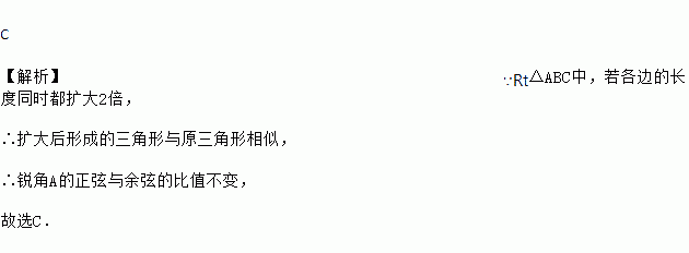 C 【解析】∵Rt△ABC中,若各边的长度同时都扩大2倍, ∴扩大后形成的三角形与原三角形相似, ∴锐角A的正弦与余弦的比值不变, 故选C.