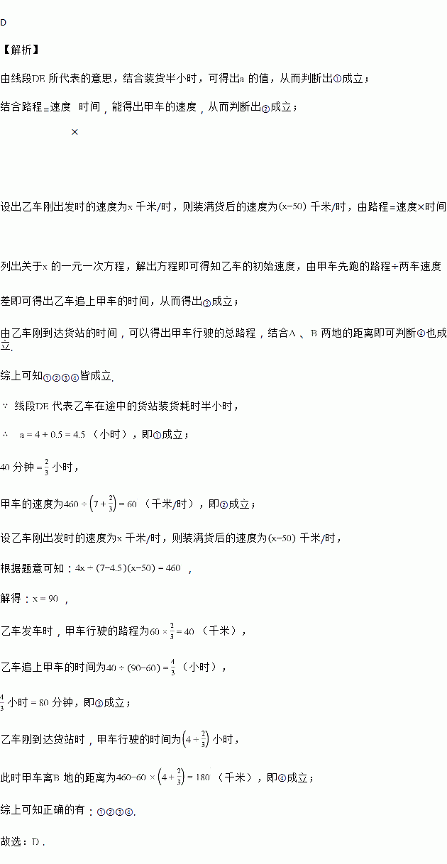 甲、乙两车从A地出发,沿同一路线驶向B地. 甲车先出发匀速驶向B地,40 min后,乙车出发,匀速行驶一段时间后,在途中的货站装货耗时半小时. 由于满载货物,为了行驶安全,速度减少了50 km/h,结果与甲车同时到达B地. 甲乙两车距A地的路程y(km)与乙车行驶时间x(h)之间的函数图象如图所示,则下列说法:①a=4.5;②甲的速度是60 km/h;③乙出发80 min追上甲;④乙刚到达货站时,甲距B地180 km.其中正确的有( )