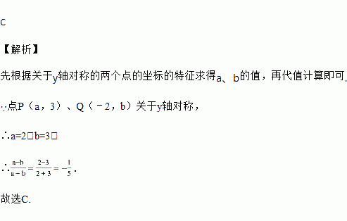 已知点P(a,3)、Q(﹣2,b)关于y轴对称,则=( )