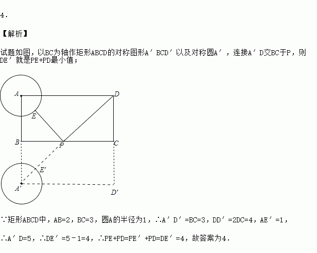如图,矩形ABCD中,AB=2,BC=3,以A为圆心,1为半径画圆,E是⊙A上一动点,P是BC上的一动点,则PE+PD的最小值是 .