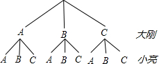 分析:先根据题意画出树状图,从图上可知小亮和大刚恰好做同一项实验的情况有3种,共有9种等可能的结果,再根据概率公式求解即可.