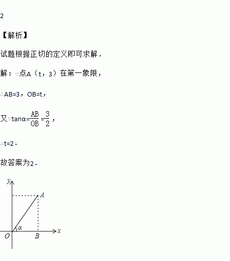 如图,点A(3,t)在第一象限,OA与x轴所夹的锐角为α,tanα= ,则t的值是________.