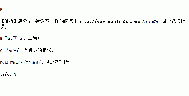 A. 8a﹣a=8 B. (﹣a)4=a4 C. a3•a2=a6 D. (a﹣b)2=a2﹣b2