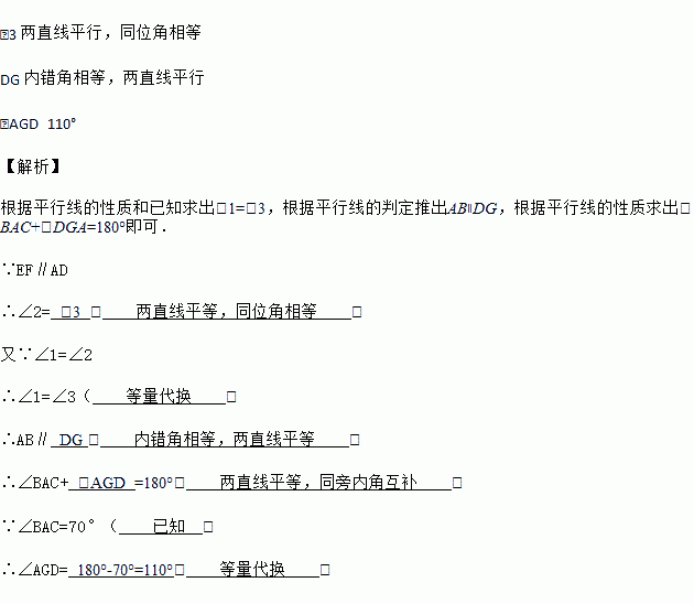 如图:EF∥AD ,∠1=∠2,∠BAC=70°,将求∠AGD的过程填写完整: