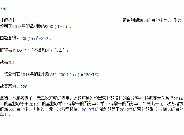 某公司在2015年的盈利额为200万元,预计2017年的盈利额将达到242万元,若每年比上一年盈利额增长的百分率相同,那么该公司在2016年的盈利额为____万元.