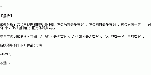 一个几何体的主视图和俯视图如图所示,若这个几何体最多有个小正方体组成,最少有个小正方体组成,则等于( )