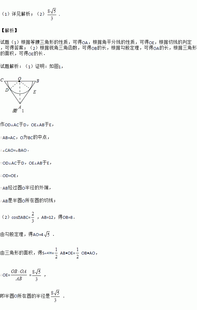 (2)若cos∠ABC=,AB=12,求半圆O所在圆的半径.