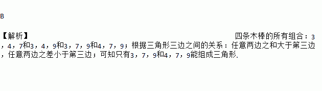 现有3cm,4cm,7cm,9cm长的四根木棒,任取其中三根组成一个三角形,那么可以组成的三角形的个数是( )