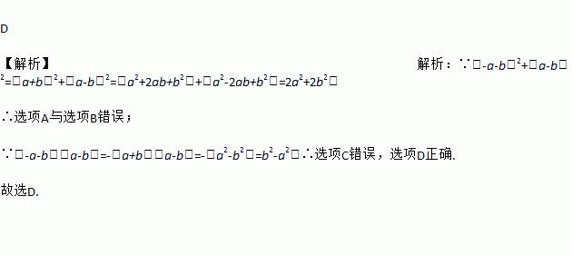 D 【解析】解析:∵(-a-b)2+(a-b)2=(a+b)2+(a-b)2=(a2+2ab+b2)+(a2-2ab+b2)=2a2+2b2, ∴选项A与选项B错误; ∵(-a-b)(a-b)=-(a+b)(a-b)=-(a2-b2)=b2-a2,∴选项C错误,选项D正确. 故选D.