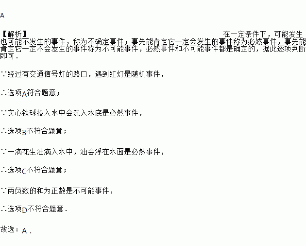 A. . 经过有交通信号灯的路口,遇到红灯 B. 实心铁球投入水中会沉入水底