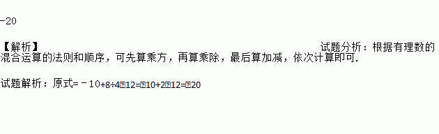 -20 【解析】试题分析:根据有理数的混合运算的法则和顺序,可先算乘方,再算乘除,最后算加减,依次计算即可. 试题解析:原式=﹣10+8÷4﹣12=﹣10+2﹣12=﹣20